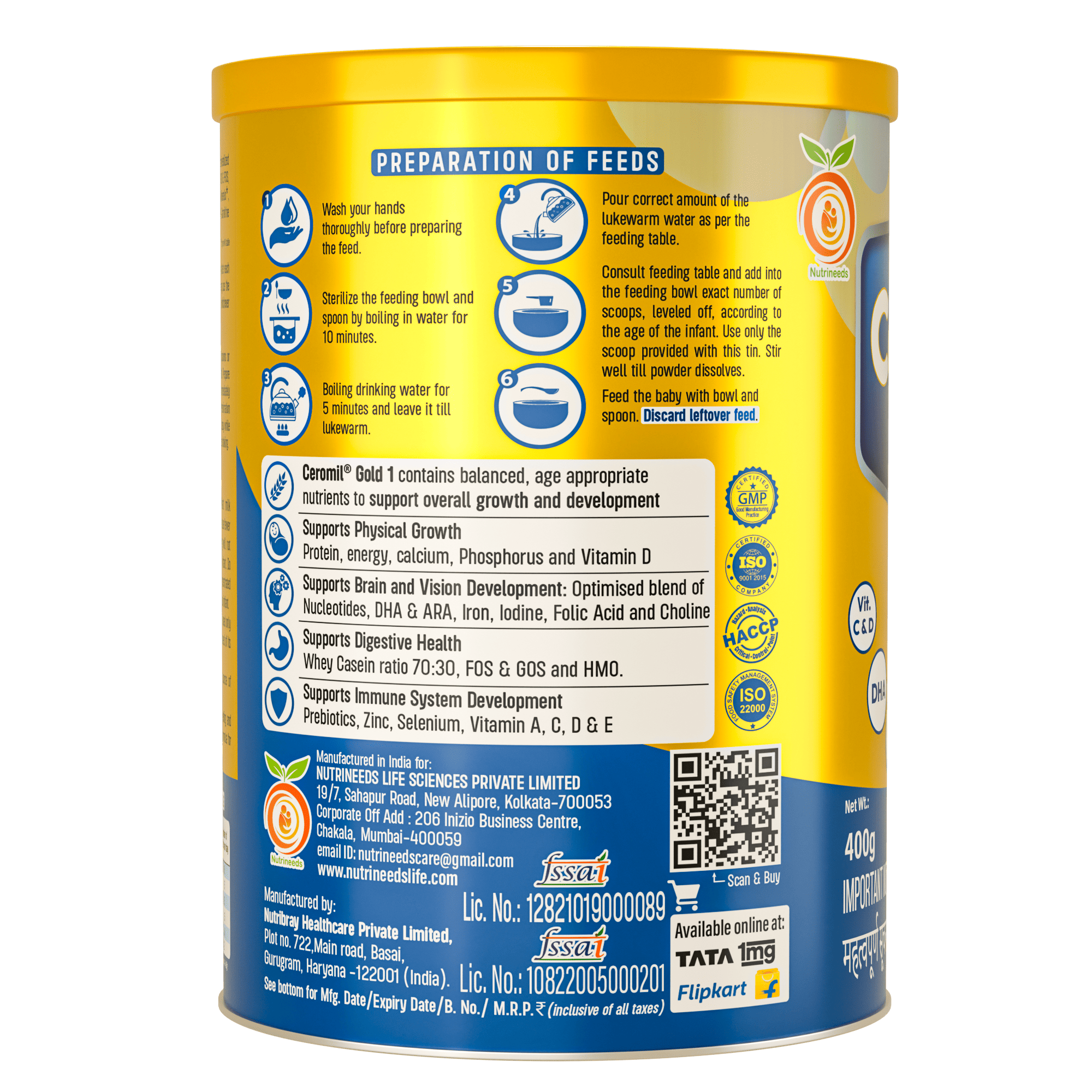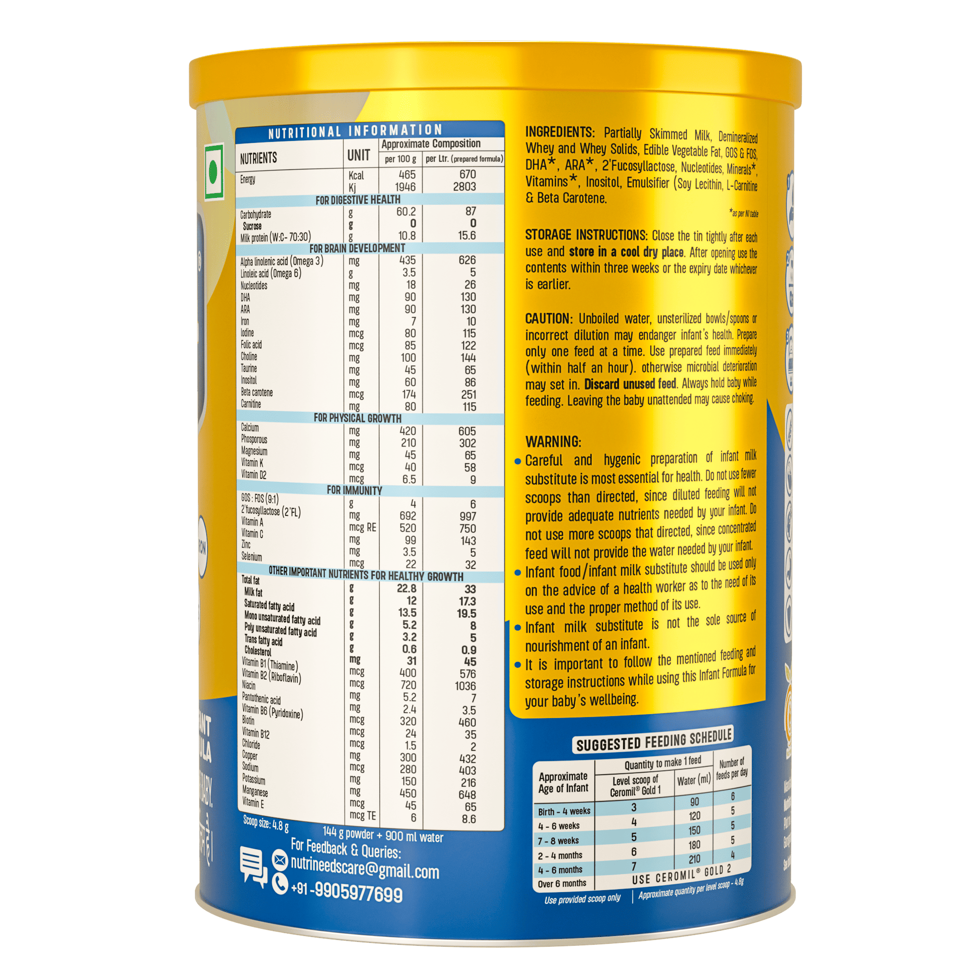 Ceromil Gold 1 is a nutritionally balanced infant formula designed for babies from birth to 6 months. It contains an age-appropriate blend of nutrients to support overall growth and development. The formulation includes HMO 2’FL, DHA and ARA to support brain and vision development, along with nucleotides, iron, iodine, folic acid and choline. A whey-casein ratio of 70:30 along with prebiotics FOS and GOS helps support digestive health, while essential vitamins and minerals such as vitamins A, C, D, E, zinc and selenium support immune system development. Ceromil Gold 1 is manufactured in India and should be used only on the advice of a healthcare professional.